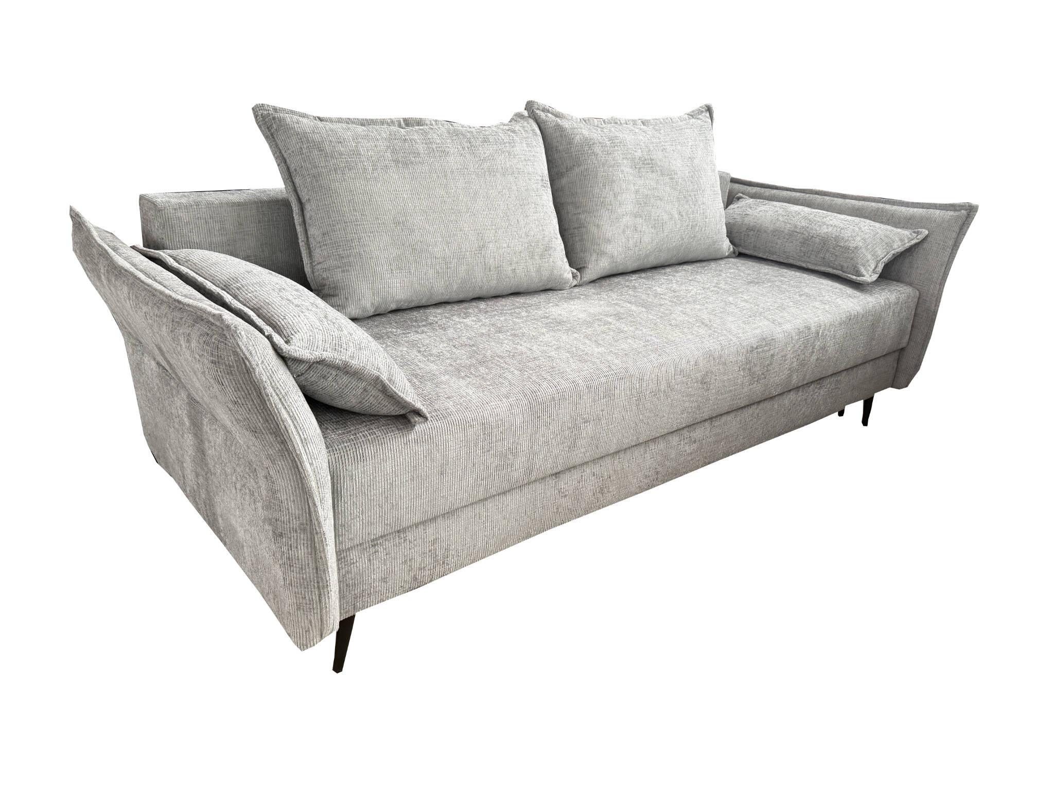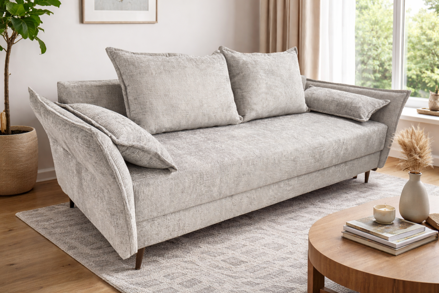 Kanapa ALAN to propozycja dla tych, którzy lubią prawdziwy komfort i większy format. Szerokie siedzisko, puszyste poduchy oparcia oraz stylowe, lekko wyprofilowane boki tworzą kanapę, na której świetnie się odpoczywa – a po rozłożeniu zyskujesz pełnowymiarowe miejsce do spania. Idealna do salonu, gdzie liczy się zarówno wygląd, jak i wygoda.