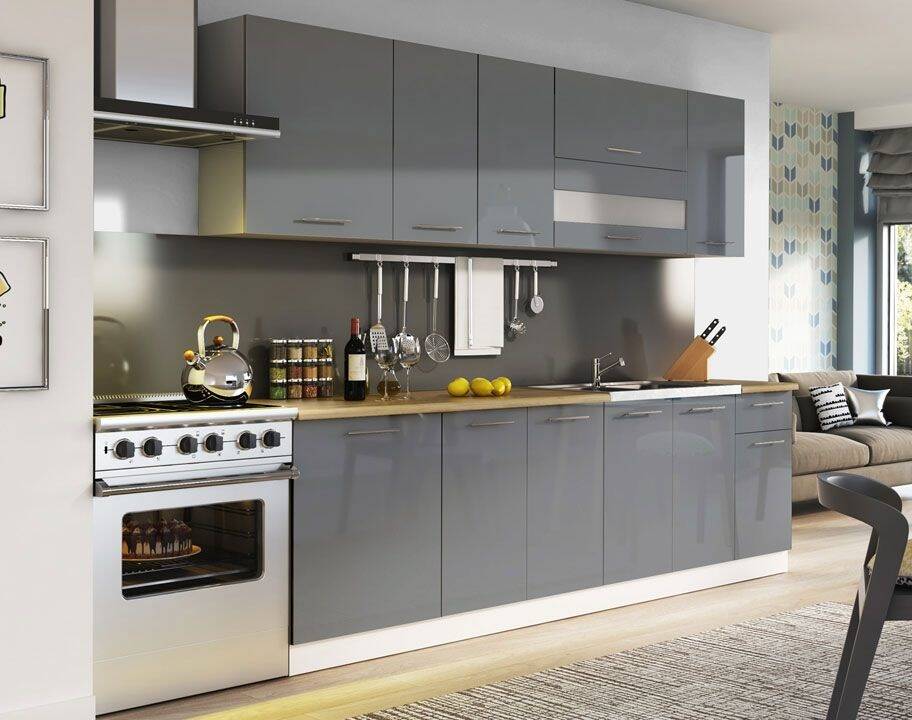 Tiffany to kuchnia o wysokim standardzie, która posiada metalowe uchwyty, cichy domyk drzwi i szuflad oraz fronty wykonane z wysokiej jakości płyty MDF w kolorach biały połysk lub szary połysk. Korpusy oraz cokoły wykonano z płyty meblowej w kolorze biały mat.