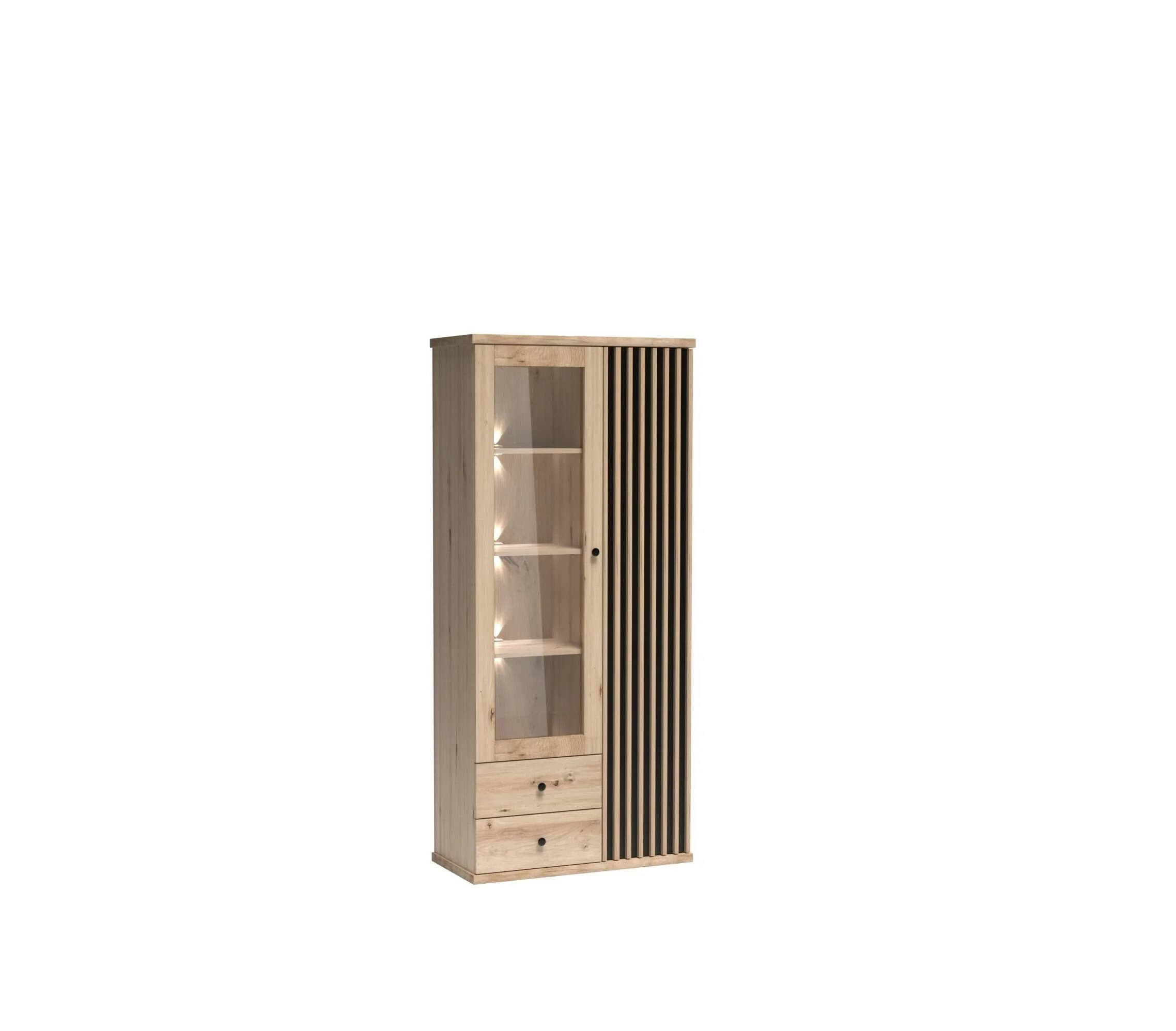 Nowoczesna witryna z listwami na czarnym tle. Mebel idealny do jadalni czy salonu. Wyobraźcie sobie wnętrze z meblem, który tworzy klimat, coś czego jeszcze nie było, dekoracyjne lamele na ciemnej płycie z dodatkiem metalowych nóg i oświetlenia – wasze wnętrze stanie się atrakcyjne. Szklany front w witrynie to rozwiązanie do wyeksponowania naczyń czy świątecznej zastawy.