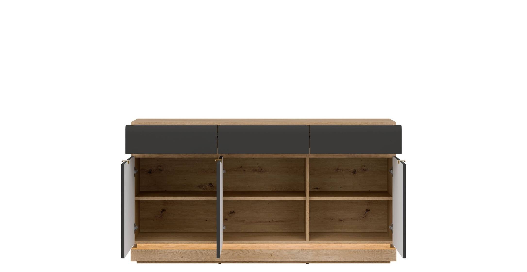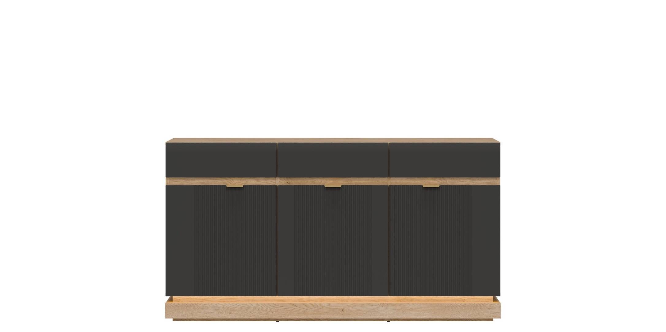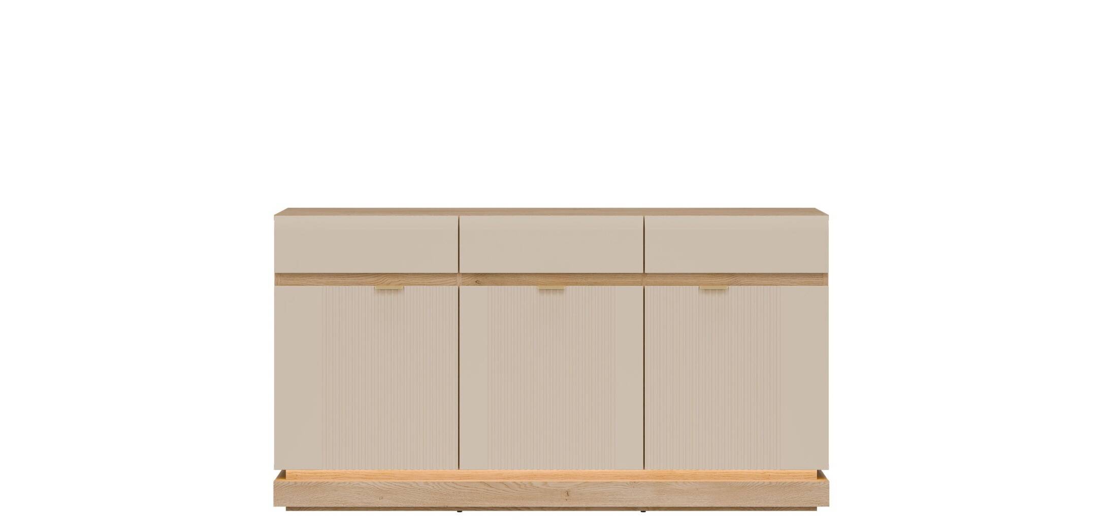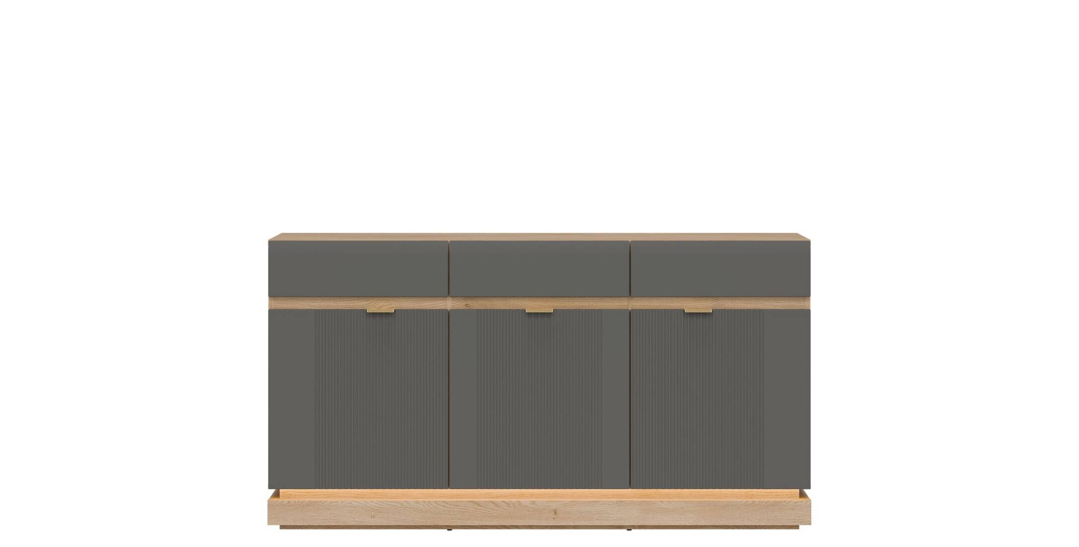 Nowoczesna komoda ML03 z kolekcji MILTON to idealna propozycja dla osób, które poszukują funkcjonalnych rozwiązań w eleganckim wydaniu. Fronty MDF w matowym wykończeniu dostępne są w różnych wariantach kolorystycznych, a ich pionowe frezowanie dodaje meblowi subtelnej dynamiki i wyjątkowego charakteru. Złote uchwyty stanowią gustowny akcent, podkreślając nowoczesny styl mebla. Komoda została zaprojektowana z myślą o praktycznym użytkowaniu – oferuje pojemne wnętrze, które pomieści zarówno tekstylia, jak i codzienne drobiazgi, zachowując przy tym estetyczny porządek w pomieszczeniu. Korpus w dekorze dąb cremona torro wprowadza do aranżacji naturalne ciepło i tworzy atrakcyjny kontrast z frontami w wybranym kolorze. Opcjonalne oświetlenie LED w dolnej części komody dodaje lekkości formie i buduje nastrojową atmosferę. Model ML03 doskonale sprawdzi się w salonie, jadalni, sypialni lub przedpokoju, wpisując się zarówno w nowoczesne, jak i bardziej klasyczne wnętrza.