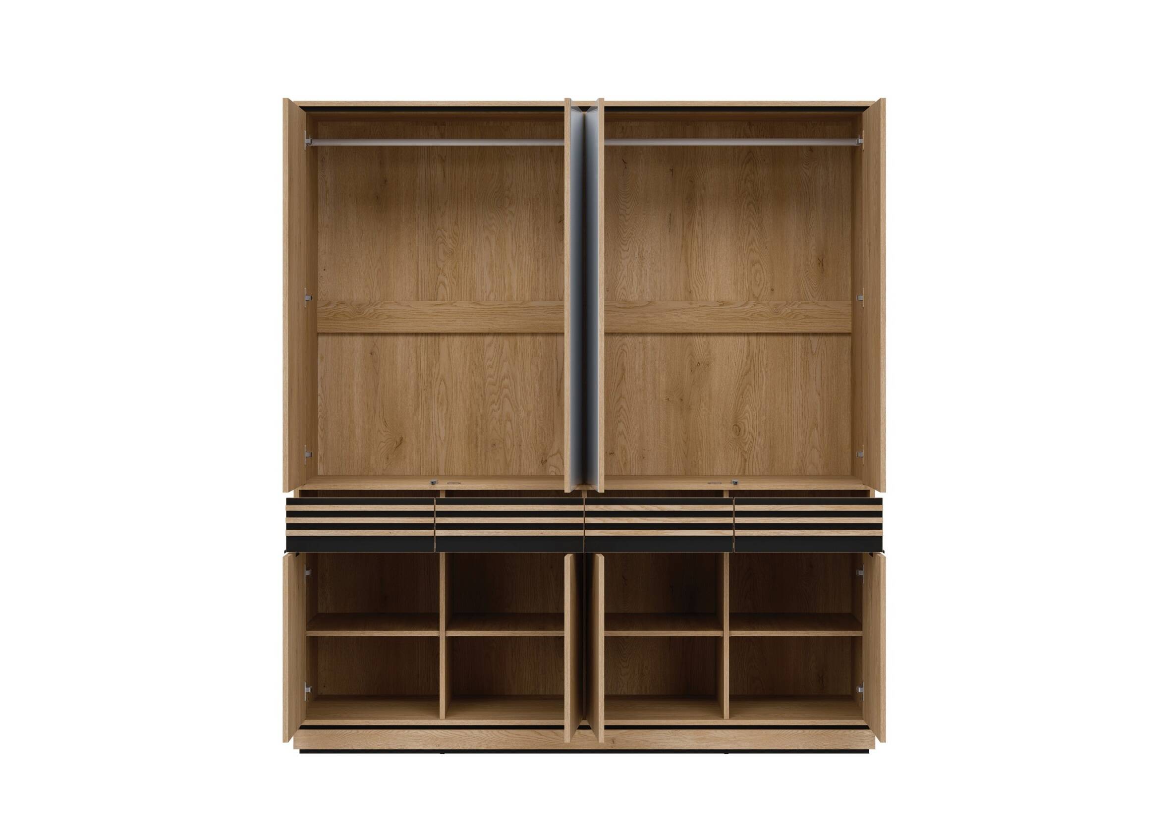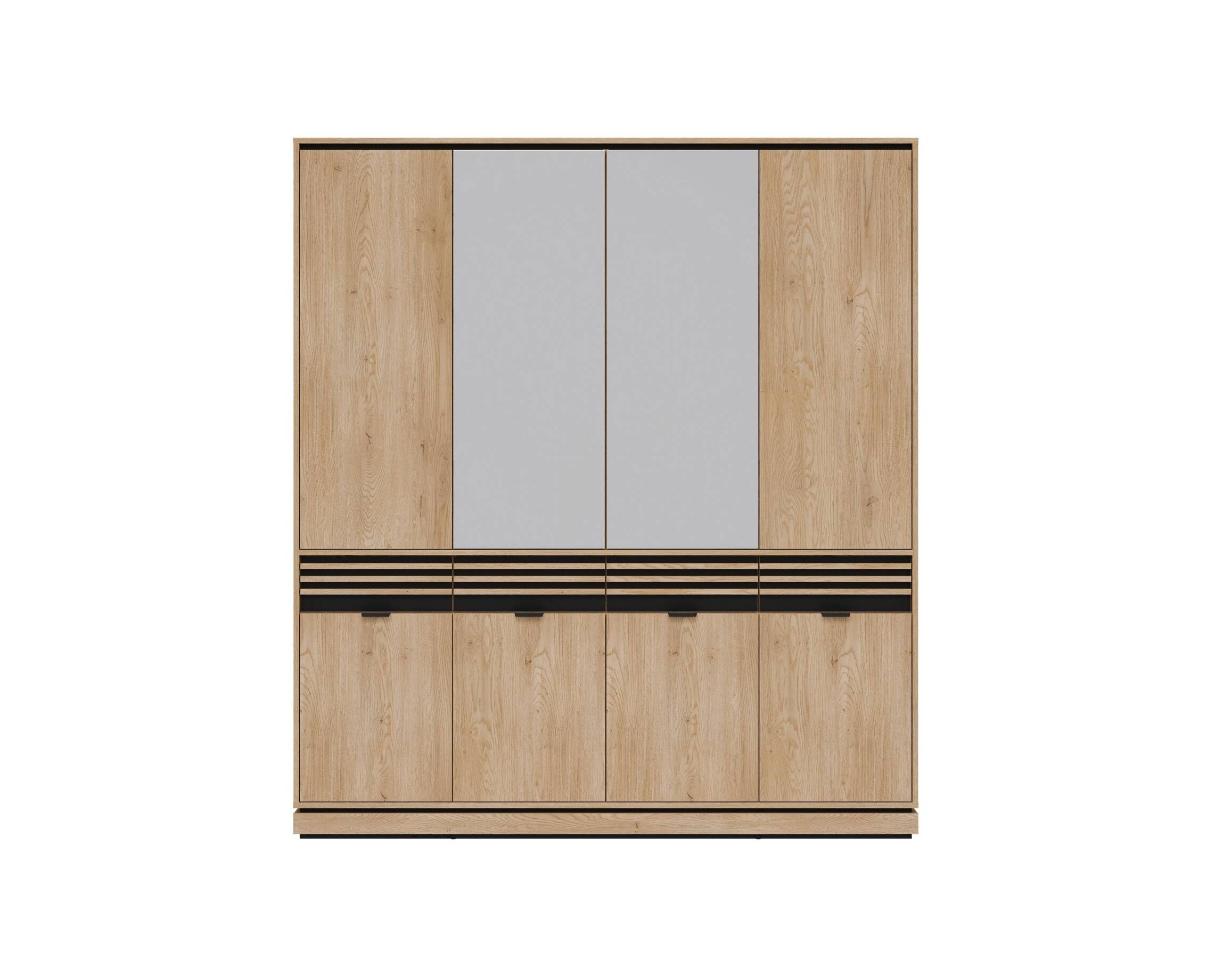 Poranne przygotowania do wyjścia staną się dla Ciebie przyjemnością z szafą Ferro FE11. Za 4-drzwiowym frontem kryje się mnóstwo półek i drążki, które pomogą Ci zorganizować swoją garderobę. Lustro na froncie szafy będzie Twoim codziennym towarzyszem podczas wyboru odpowiedniej stylizacji. Neutralny odcień dębu cremona torro oraz czarne akcenty doskonale komponują się z jasnymi i ciemnymi wnętrzami, dając Ci pełną swobodę w aranżacji Twojej sypialni.