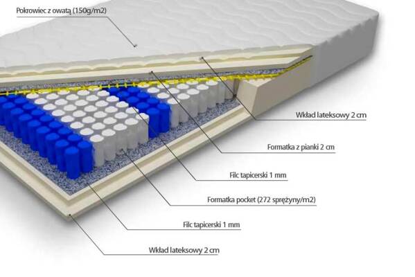 Do tego materaca polecamy stelaże bez regulacji. Materace pocket należy użytkować ze stelażami, których prześwit listew nie jest większy, niż 5 cm.